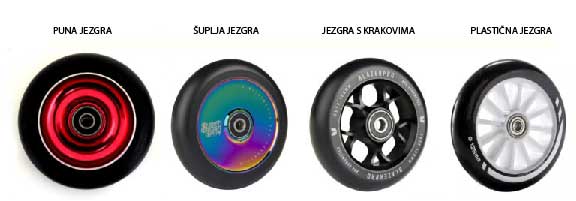 Šuplja i aluminijska jezgra najbolja je (i skuplja) opcija za napredne korisnike. Kotači s mekšom, plastičnom jezgrom preporučuju se početnicima i onima koji još uvijek uče osnove i novi su u svijetu izvođenja trikova s romobilima.